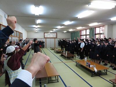 つぎに、第30回串間市美術展、第51回宮崎県アンサンブルコンテスト、「税に関する高校生の作文」などで好成績をおさめた生徒たちが登壇し、その健闘が称えられました。