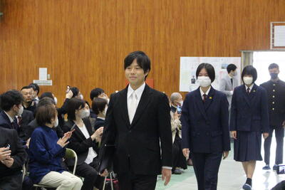 吹奏楽部の演奏で127名の新入生が入場し、保護者や在校生、職員が