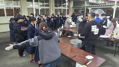 今日は三年生に向けて、PTAの方々が真心の【合勝うどん】をふるまってくださいました。