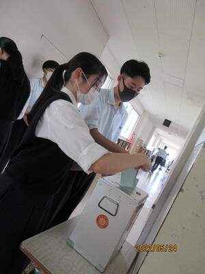 体育館でそれぞれの立候補者の演説を聞いた後、教室前の廊下に設置された記載台と投票箱を使って投票を実施しました。
