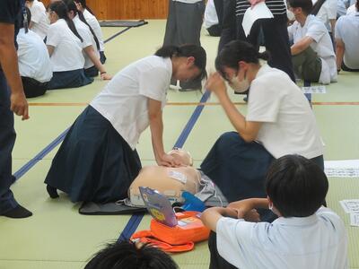 日南市消防本部の方々が本校に来てくださり、心肺蘇生法の講習会を開いてくださいました。