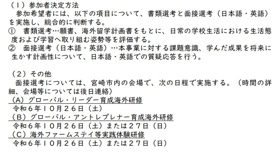 事業目的 海外留学の促進、国際理解教育の推進をとおして、地域や県内企業を支え、宮崎から世界へ挑戦するグローバル人材の育成を目指す。 コ-ス 3 各コースの研修目的 (B)グローバル・アントレプレナー育成海外研修 2/24-3/5 (C)海外ファームステイ等実践体験研修 2/16-2/25 詳細については応募要項を熟読の上、9月9日【火曜】以降に掲示されるポスタ-とチラシにある二次元バ-コ-ドを読み込んで特設ペ-ジから申込みを行って下さい。その際、「参加申込フォーム」は県教育委員会より配付されたGoogleアカウント(@g.miyazaki-c.ed.jp)からのみ回答が可能です。 申込期間 9月9日(火)~9月29日(月)17:00*特設ペ-ジからWeb上で申込 |