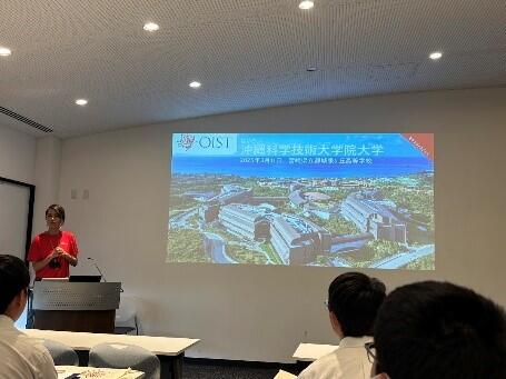 本校生徒が、自身の探究テーマについて英語で発表し、OIST関係者に多くの助言をいただきました。オールイングリッシュで3ターム行われ、生徒たちは緊張で序盤ぎこちない雰囲気がありましたが、最後は堂々と英語で質疑応答までこなしていました。