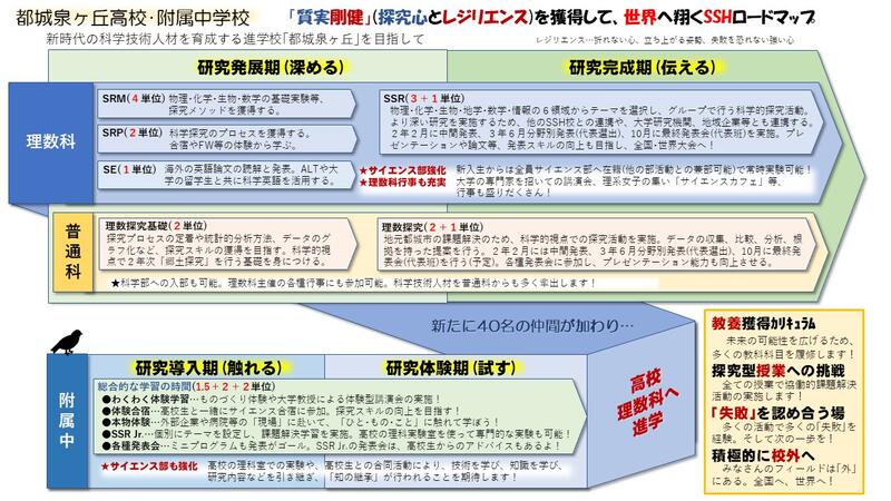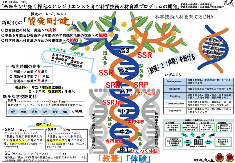 中高一貫6年間及び普通科・理数科高進生3年間において,「教養」の獲得と, 「体験」の機会を拡充した探究型カリキュラムを設定し,探究を繰り返すことで, 探究スキルと折れない心・立ち上がる姿勢(レジリエンス)を身につけ,未来を科 学の力でよりよくしようと努める人材育成のためのプログラムを研究開発し,実践する。