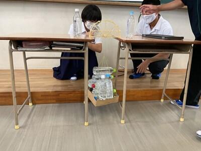 最終コマ(9月13日)は校内パスタブリッジコンテストが実施されました。審査委員は管理職を含む3名が行い①プレゼンテーション(2分)、②橋の独創性(デザイン)、③橋の強度の3点について審査を行いました。全ての班が試技の時の記録を大きくクリアし、大変盛り上がりました。