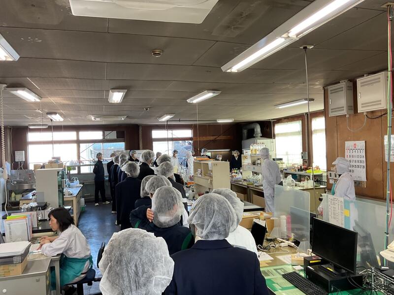 ヤマエ食品は市販用の味噌、醤油、めんつゆ、ドレッシングやポン酢など様々な商品を作られていますが、毎日食卓で見ている商品や調味料がヤマエ食品で作られていることを知り生徒たちは驚いている様子でした。工場の中に入ってみると醤油のいい香りが生徒たちを惹きつけているようでした。今回は、開発部の実験室も見学させていただきましたが、普段口にしているものが詳細な分析の末に作られ、日々改良され続けていることと、自分たちが現在行なっているミニ探究と重ねて考えている様子が伺えました。