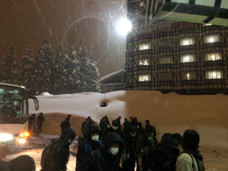 19時前に無事にホテルに着きました。暗くて分かりづらいかもしれませんが、一面銀世界です。当然のことながら、宮崎や東京と違ってかなり寒いです。