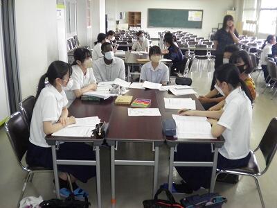 と、オープンスクールに来てくれた中学生に挨拶をしました。その後、学校紹介動画を見て、中学生は、SSHとは何か、泉ヶ丘の良いところなどを知りました。座談会では、高校生活のこと、受験に関することなどを先輩に聞いて、志望校決定や、受験に関する悩みや疑問を解消する姿が見られました。