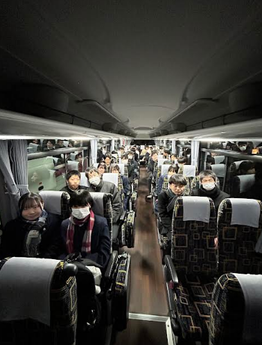 東京は思ったほど寒くなく、雨も降らず良かったです。この後、バスガイドさんの楽しい説明を聞きながら、新潟のスキー場のホテルに向かいます。