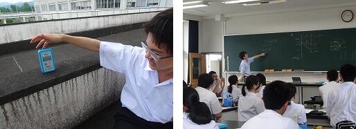左:放射線測定器を使って,校内の放射線を測定している光景です。