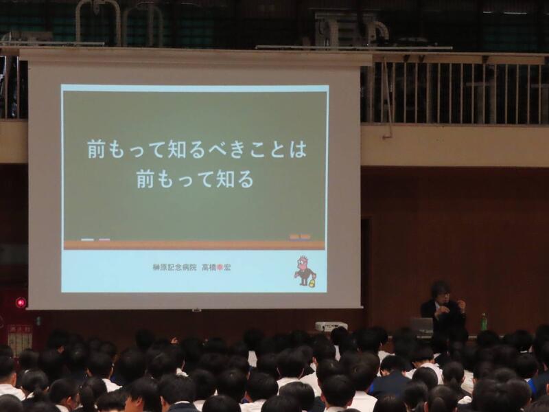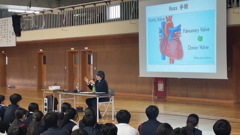 高橋さんは宮崎県日之影町のご出身で、なんと元UMKアナウンサー高橋巨典さんのお兄様です。何千人もの命を救ってきた高橋さんは、講演会の中で「前もって知るべきことは、前もって知る」ことを前提として、心臓の仕組みや小児心臓手術の方法を説明されました。その後、患者と家族への接し方やチーム医療、生徒たちに向けてキャリア・人格を形成していくために重要なことをお話してくださいました。