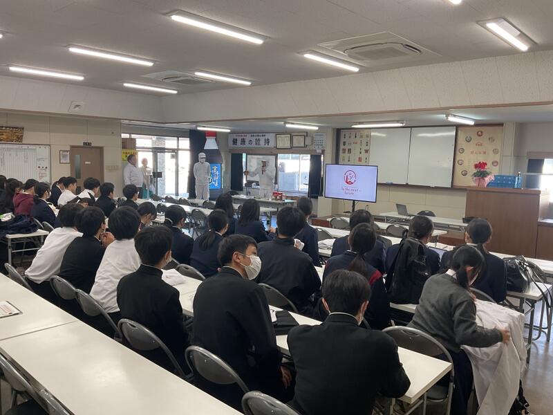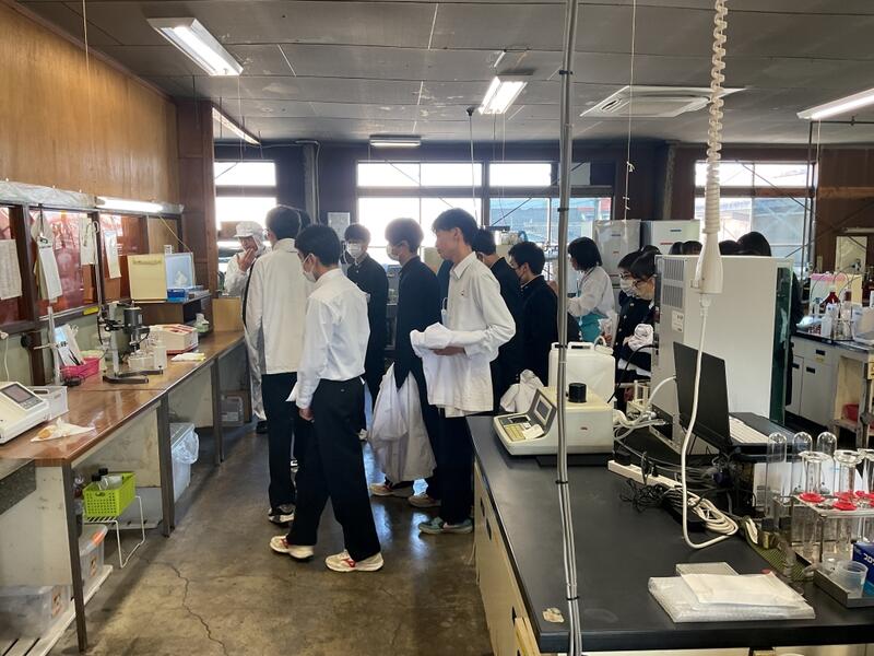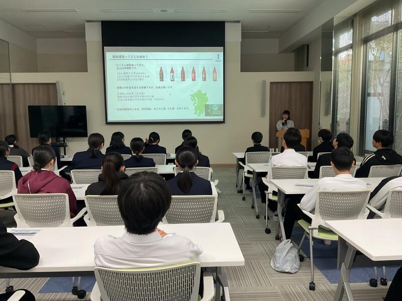 ヤマエ食品様では、都城に根差した食品製造企業としての取り組みについてご説明いただきました。店頭向けの商品だけでなく、業務用として大規模に出荷される商品も多く、地域で培われた技術が幅広い分野で活かされていることを学びました。また、研究室に入り、商品開発や品質管理に関わる取り組みを間近で見学することができました。年間およそ100アイテムにも及ぶ商品を生み出す発想力や、その背景にある試行錯誤に触れ、生徒たちは「探究活動にも活かせるのではないか」と意欲を高めていました。地域に根差しながら世界各国へ商品を展開する企業の姿に、刺激とともに大きな感動を覚える見学となりました。