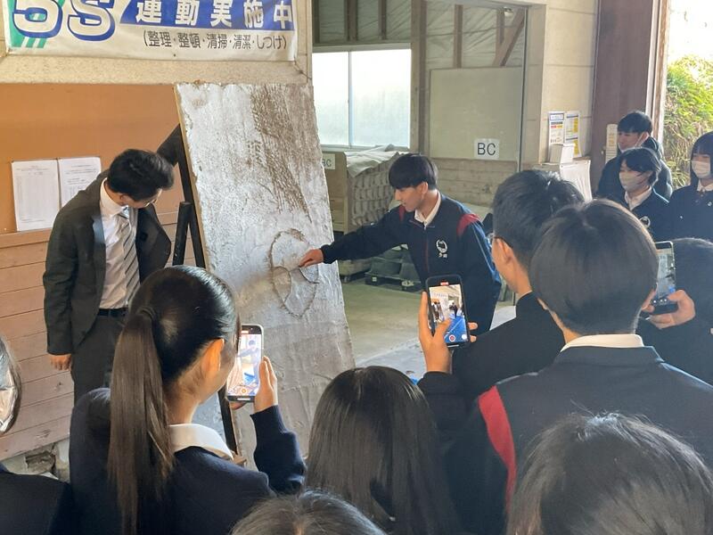 高千穂シラス様では、現地の地層を前にシラスの成り立ちについて解説を受け、身近な資材に長い地質学的歴史があることに、生徒たちは驚きと関心を示しました。