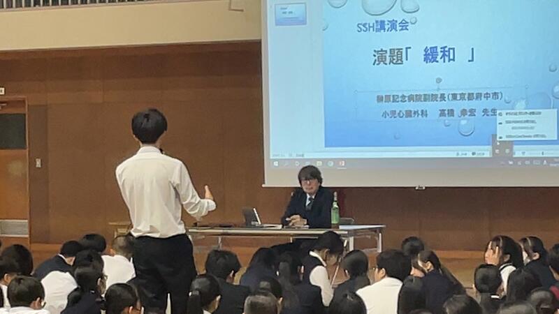 高橋さんは宮崎県日之影町のご出身で、なんと元UMKアナウンサー高橋巨典さんのお兄様です。何千人もの命を救ってきた高橋さんは、講演会の中で「前もって知るべきことは、前もって知る」ことを前提として、心臓の仕組みや小児心臓手術の方法を説明されました。その後、患者と家族への接し方やチーム医療、生徒たちに向けてキャリア・人格を形成していくために重要なことをお話してくださいました。