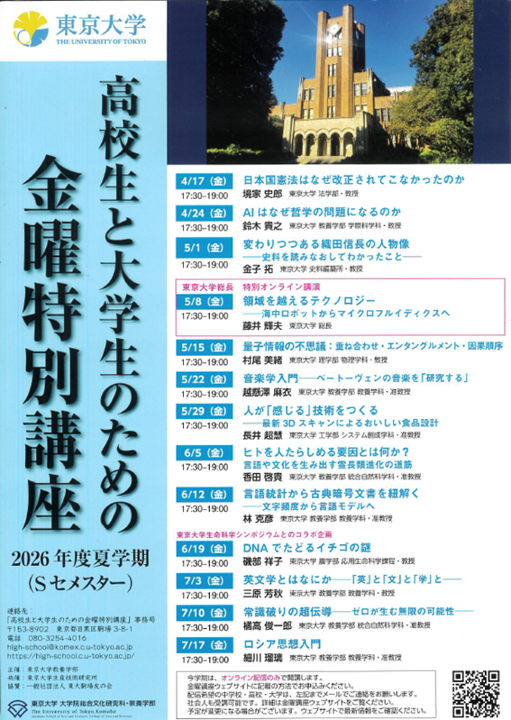 『高校生と大学生のための金曜特別講座』 東京大学教授・准教授による講座をオンラインで視聴することができます。視聴は生徒個人が学校や自宅で行います。 詳細は添付画像・PDFをご参照ください。 視聴したい生徒・興味のある生徒は、進路支援部の先生まで連絡をしてください。 |