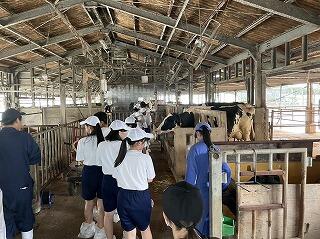 牛舎に実際に入って、様子を観察しました。まだ子どもを産んでいない牛を見ながら、先輩たちが牛に関するクイズを出していました。