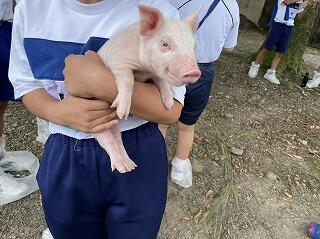 養豚部門は部屋の中には入れないので、子豚を抱く体験をしました。生まれたばかりの子豚はとてもかわいいです。