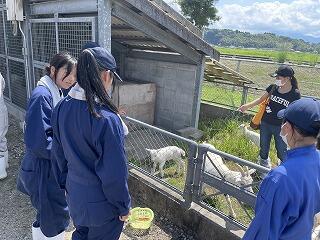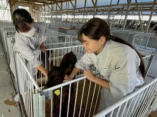 畜産科では、毎日牧場で牛、豚、鶏を育てることで、日々実践を通して学習しています。学習する中で、命の大切さを学んでいます。