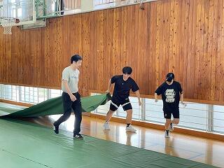 そこで、バスケットボール部・バレー部の生徒で、体育館シート引きを行いました。