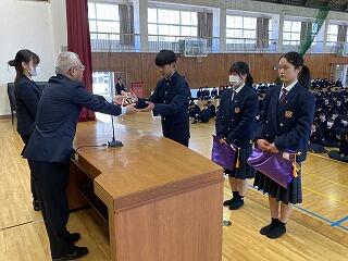 表彰式では、さまざまな分野で活躍した生徒たちが壇上に立ち、教頭先生より賞状が手渡されました。