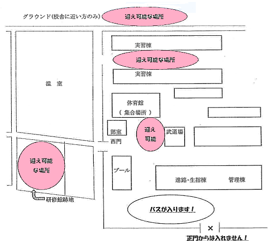 ❍ 迎えの際はバスが正門内に到着しますので、車での正門からの出入りはできません。