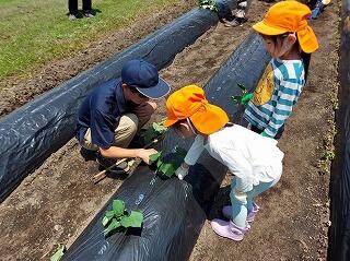 作物専攻の生徒が、近くのいなり認定こども園の園児に芋の苗の定植を教えました。