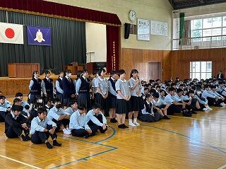 生徒会長が激励の言葉を述べ、野球部・水泳部のキャプテンは、大会に向けて全力を尽くして戦うことを誓いました。