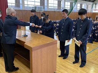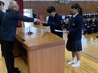 3学期終業式が行われました。部活動等の表彰の後、皆勤賞の生徒表彰が行われました。