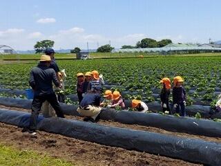 作物専攻の生徒が、近くのいなり認定こども園の園児に芋の苗の定植を教えました。