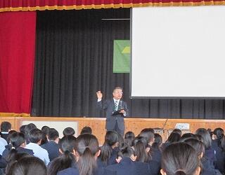 総合的な探求の時間に、宮崎県立農業大学校の説明会が行われました。講師として、農業大学校の副校長先生と2年生の生徒(都城農業高校卒業生)をお招きし、テレビで放送されたビデオを通してわかりやすく懇切丁寧な農大についての説明をしていただきました。また、生徒からの率直な疑問にも分かりやすく答えていただき、中身の濃い50分間の説明会となりました。