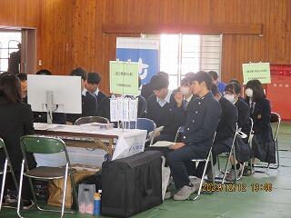 午前は、各学級においてマナー講座、面接実践練習がありました。午後は上級学校55校と企業30社に来ていただき、進学希望・就職希望者が分かれてブースを回り説明を伺いました。それぞれが3年生に向けての意欲を持ち、新年度につなげてほしいです。