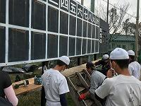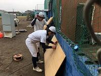 観覧席、打撃用ネットの修復、台風で崩壊してしまったプレハブ、得点板・・