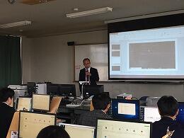 また、進学・就職の内定を得ている生徒が、進路体験を発表しました。課題研究を代表して、フューチャーセンター班がプレゼンテーションを行いました。