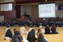 表彰伝達式では、県アンサンブルコンテストで金賞を受賞した金管八重奏とクラリネット四重奏の吹奏楽部が表彰を受けました。全校集会では教頭先生が講話され、青山学院大学駅伝部の原監督の話をもとに、1月にある多くの検定試験を全力で乗り越えてほしいという話をされました。その後、各学年ごとに分かれて学年集会が行われました。