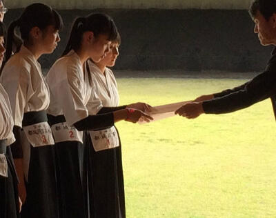 本日,第34回早水体育文化センター創立記念弓道大会に参加しました。一般の部と高校の部があり,団体戦は,都商女子A(福岡・中留・中村)が男女合わせた中で第3位に入賞しました。個人では,高校女子の部において,中堂薗が2位,持永が3位に入賞するなど,健闘を見せました。来週に控えた高校総体に向けて大きな弾みとなりました。