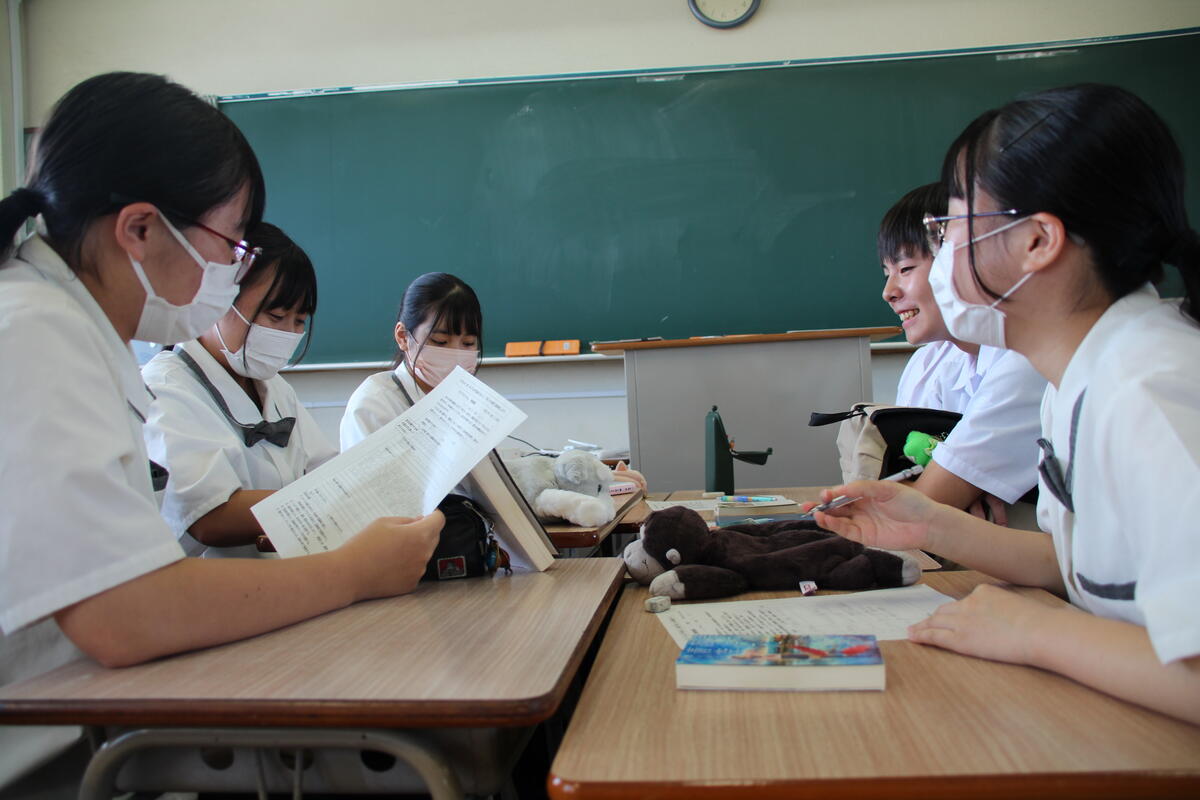 生徒は前日までに紹介本の発表原稿を作成し、グループごとに発表し、質問や意見を出し合いました。