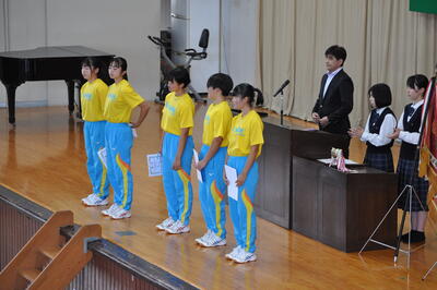各部部長からの決意表明、教頭から陸上競技部主将への団旗授与、生徒会長激励の言葉があり、選手を代表して男子卓球部主将が宣誓を行いました。