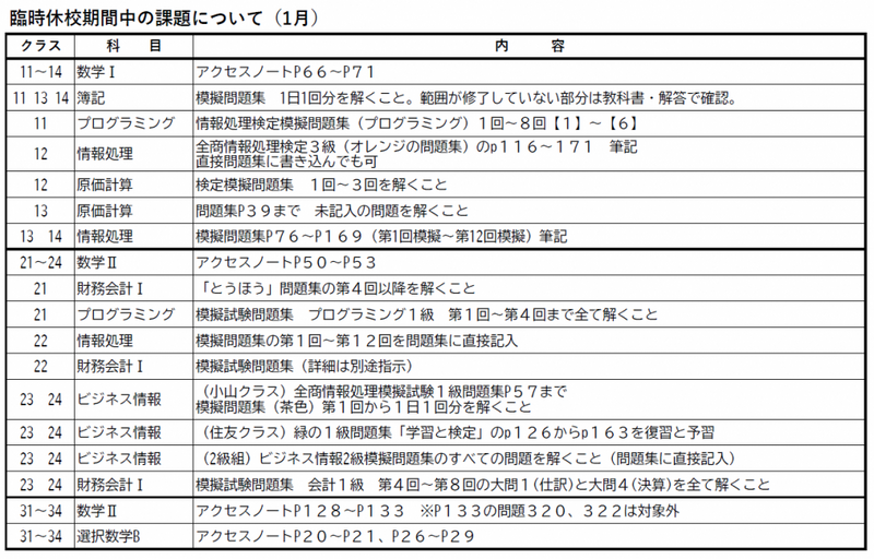 都城商業高校は1月17(日)まで臨時休業になります。登校日はありません。部活動も停止とします。臨時休校期間中は不要不急な外出はせず、自宅での学習に取り組むようにお願いいたします。学習課題や指示等については、防災メールやwebページにて連絡いたしますので、必ず毎日確認をしてください。