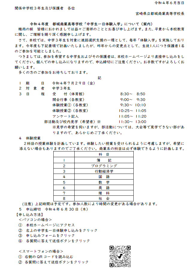 令和4年度 都城商業高等学校「中学生一日体験入学」について