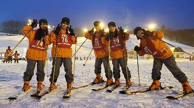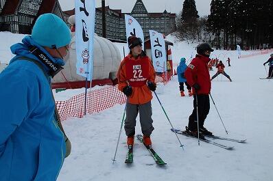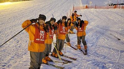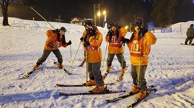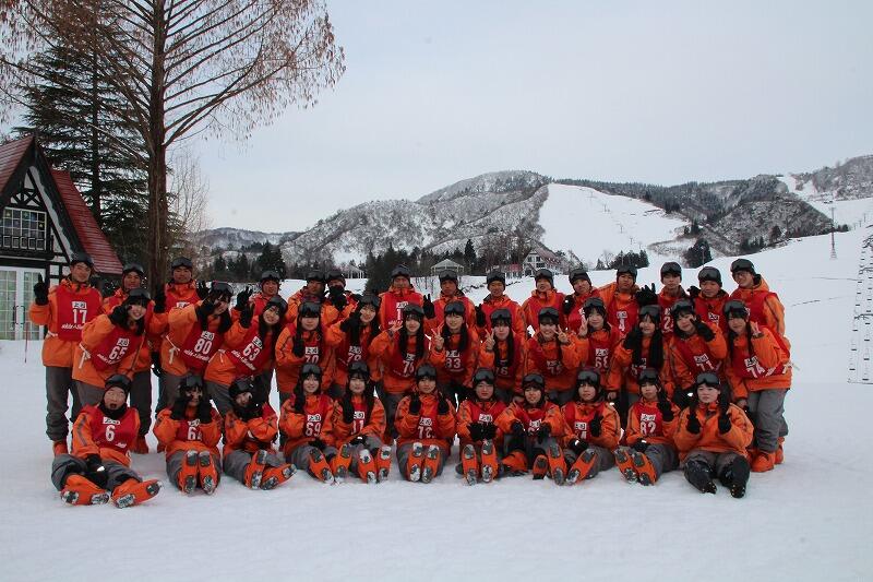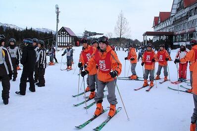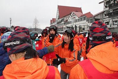 スキーウェアに着替え、慣れないスキーブーツをはき、ゲレンデに出てスキー講習の開校式が行われました。