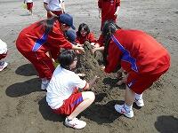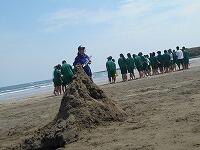 クラスごとに10分間で砂山を作成し、高さを競い合います。