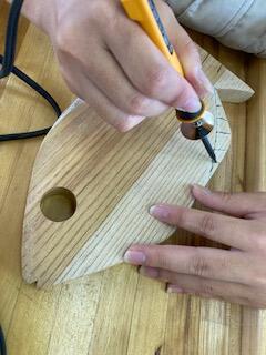 放課後の実習室では、ウクレレを仕上げるため生徒が頑張っていました。
