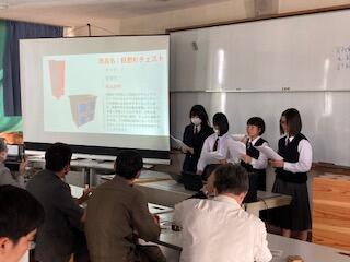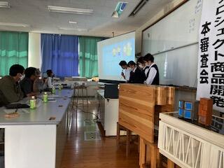 本日1年生は飫肥杉プロジェクト商品開発の本審査を迎えました。都城家具工業会さまに来校頂き審査を行ってもらいました。各10班に分かれ商品化すべき作品をプレゼンテーションしました。1人一台のタブレット導入により、プレゼンテーションの仕方も変わってきています。アニメーションや調査結果やデータからの提案もありました。