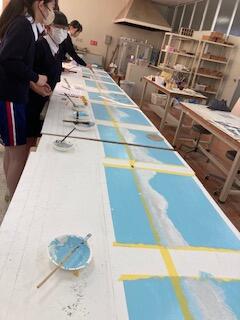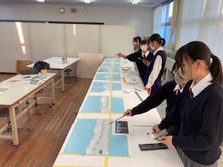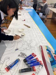 12/3(日)に三股町内の小学校渡り廊下に壁画制作を行います。当日は小学生、近隣の方々も参加し仕上げていく予定です。短時間の交流になりますので、本校で7~8割制作し持ち込む形です。