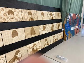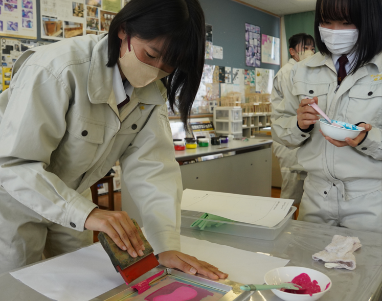 3年生は実習でシルクスクリーン演習の時間が設定されています。各自デザインし配色まで考えました。展示後は自宅にお持ち帰りです。