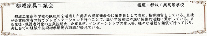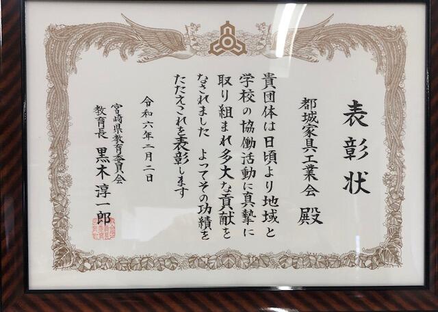 地域全体で次世代を担う子供たちを育成するため、地域と学校が連携・協働し、地域の教育力の向上を図ることを目的に取り組みが優れた個人、団体に功績をたたえ教育長が表彰するものです。今年度4個人、6団体が選ばれ、インテリア科と長年連携している都城家具工業会が選ばれました。