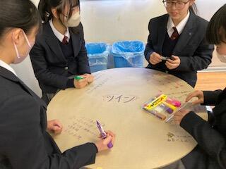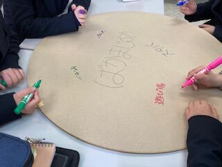 グループワークで使ったのが「えんたくん」。段ボールで出来た直径1mの円形のボードです。1年インテリア科の授業で11月に町興しイベント(西都城駅内装木質化)に向け話合いを行いました。自分だったら何があったら行くのか?人溜まりにするには?など活発な意見交換ができました。来週は各班に分かれ発表です。協働的な活動の場でした。