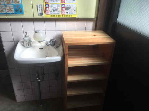 使用していない流し台の上に棚を設置しました。背面に水道蛇口もあり現地でサイズ確認して制作しました。踏み台も制作して、婦人会の方々にも喜んでもらいました。