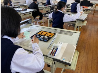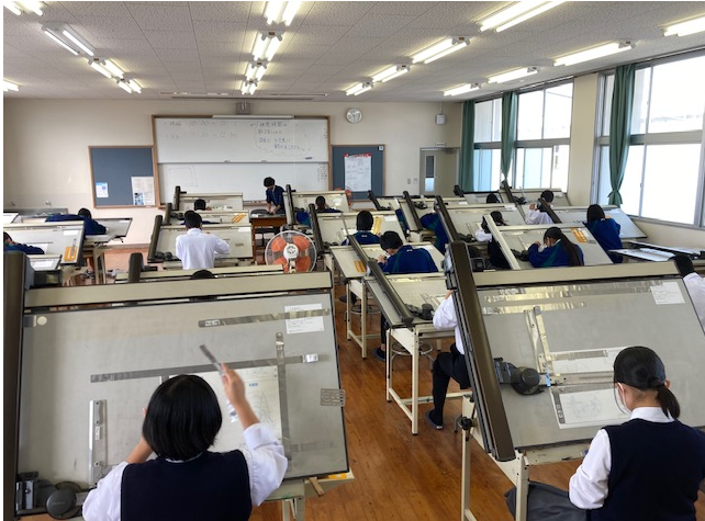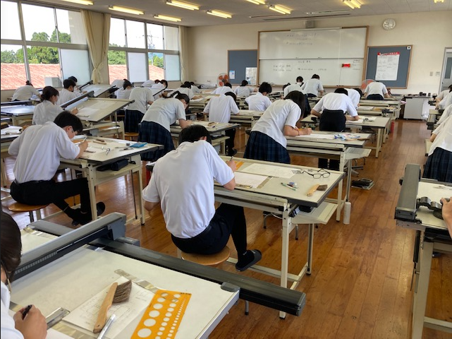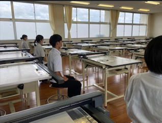 指定された用紙に配置図兼平面図1/100、断面図1/100、立面図1/100、面積表を3時間で作図するものです。試験当日は、建築士会の先生方が監督し審査まで行ってもらいました。生徒にとっては緊張感ある時間でした。