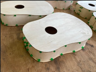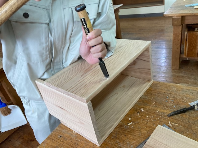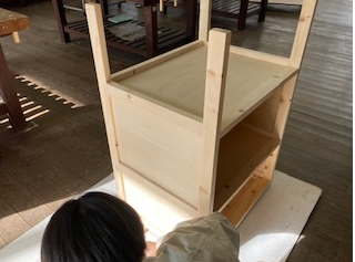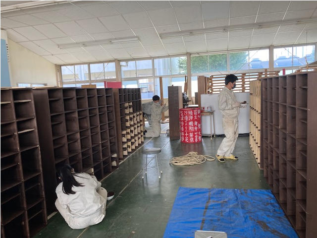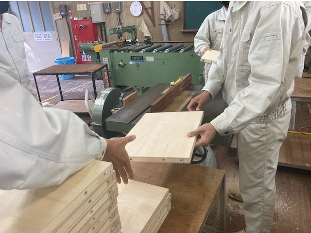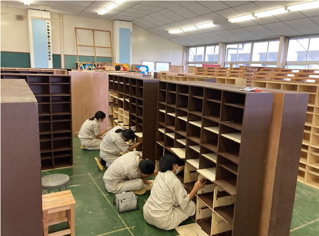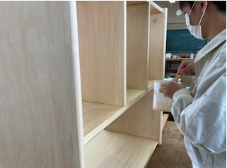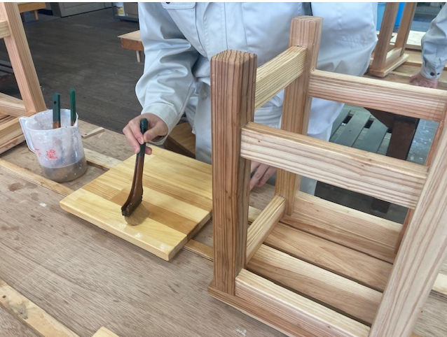 3年生は、スツール(小椅子)塗装に入りました。同時に並行してTVボードの材料加工も行っています。3年間の総仕上げ。丁寧に大切に仕上げを心がけています。